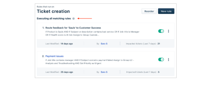注意:削除されたチケットとスパムとしてマークされたチケットに対しては、チケット作成時に実行されるルールは実行されません。