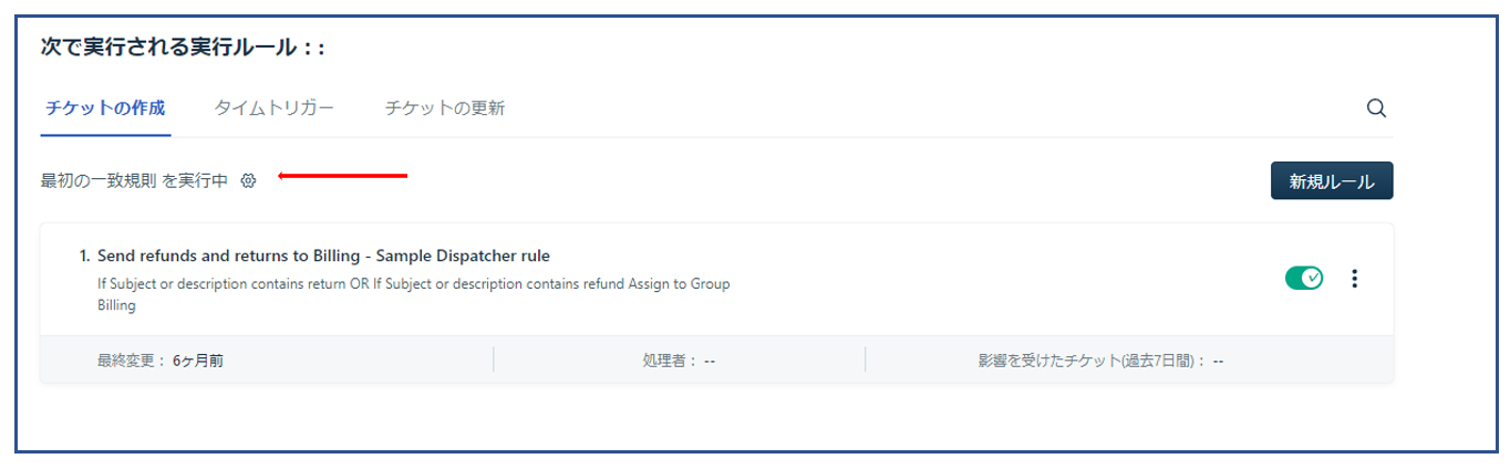 このルールの順番は非常に重要です。なぜなら、どのチケットでも最初にマッチしたルールのみが実行されるからです。全てのルールをチケットに対して実行したい場合、ルールリスト上部のチケットの歯車のボタンをクリックし、最初の一致規則に基づく実行ルールを選択してください。保存をクリックしてください。