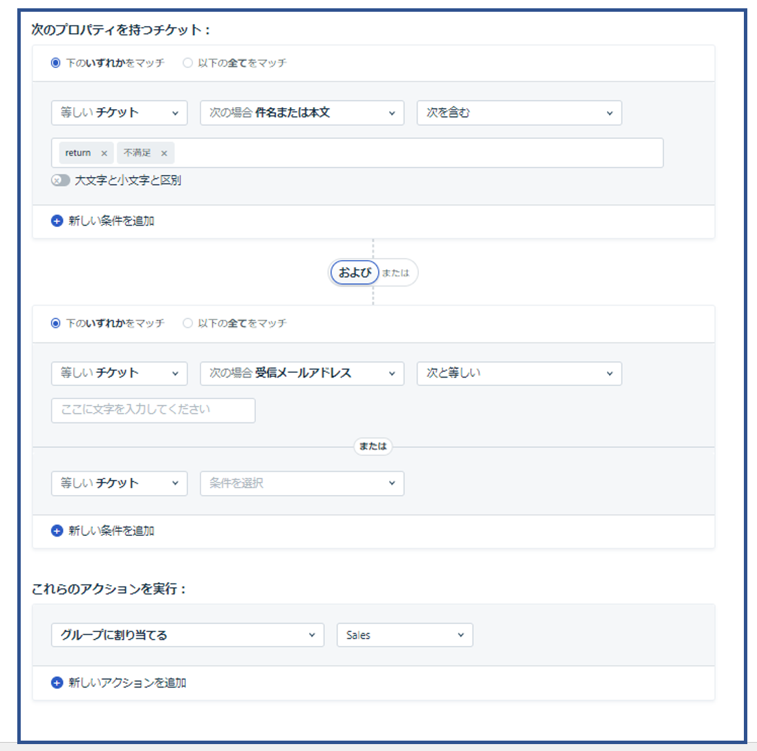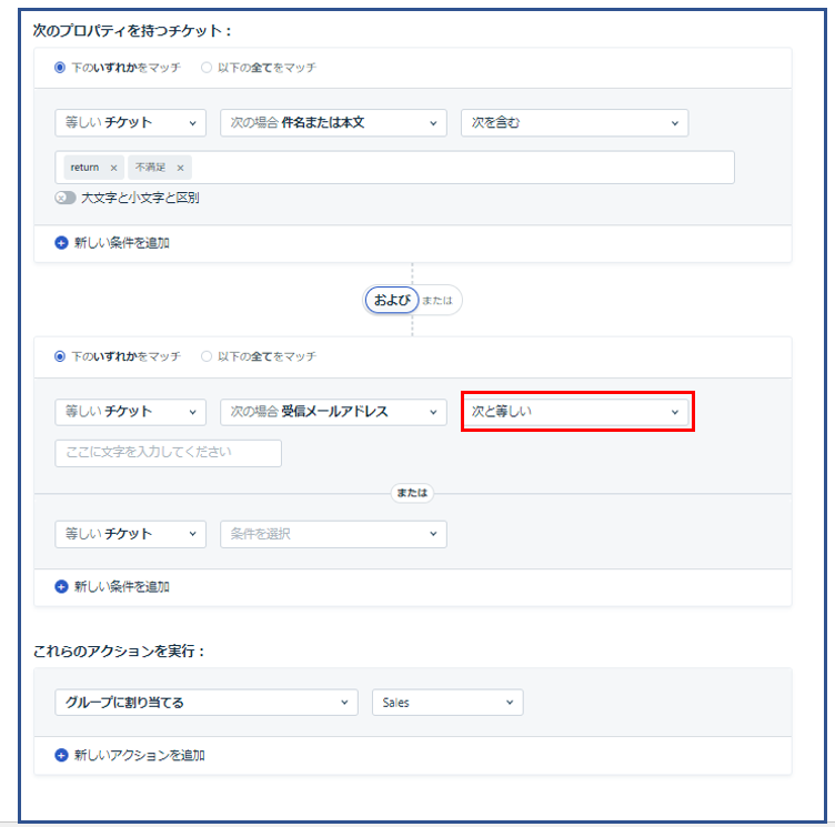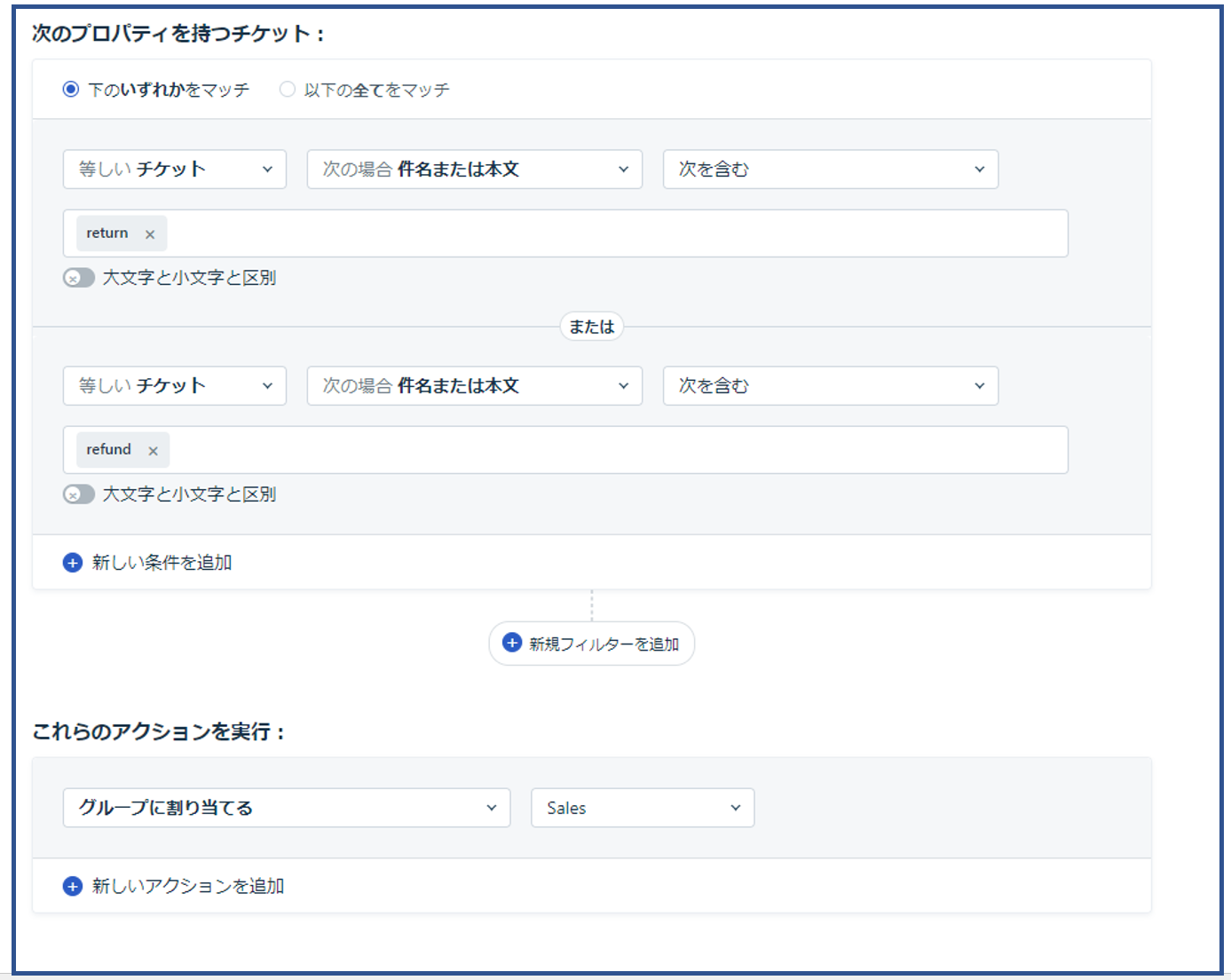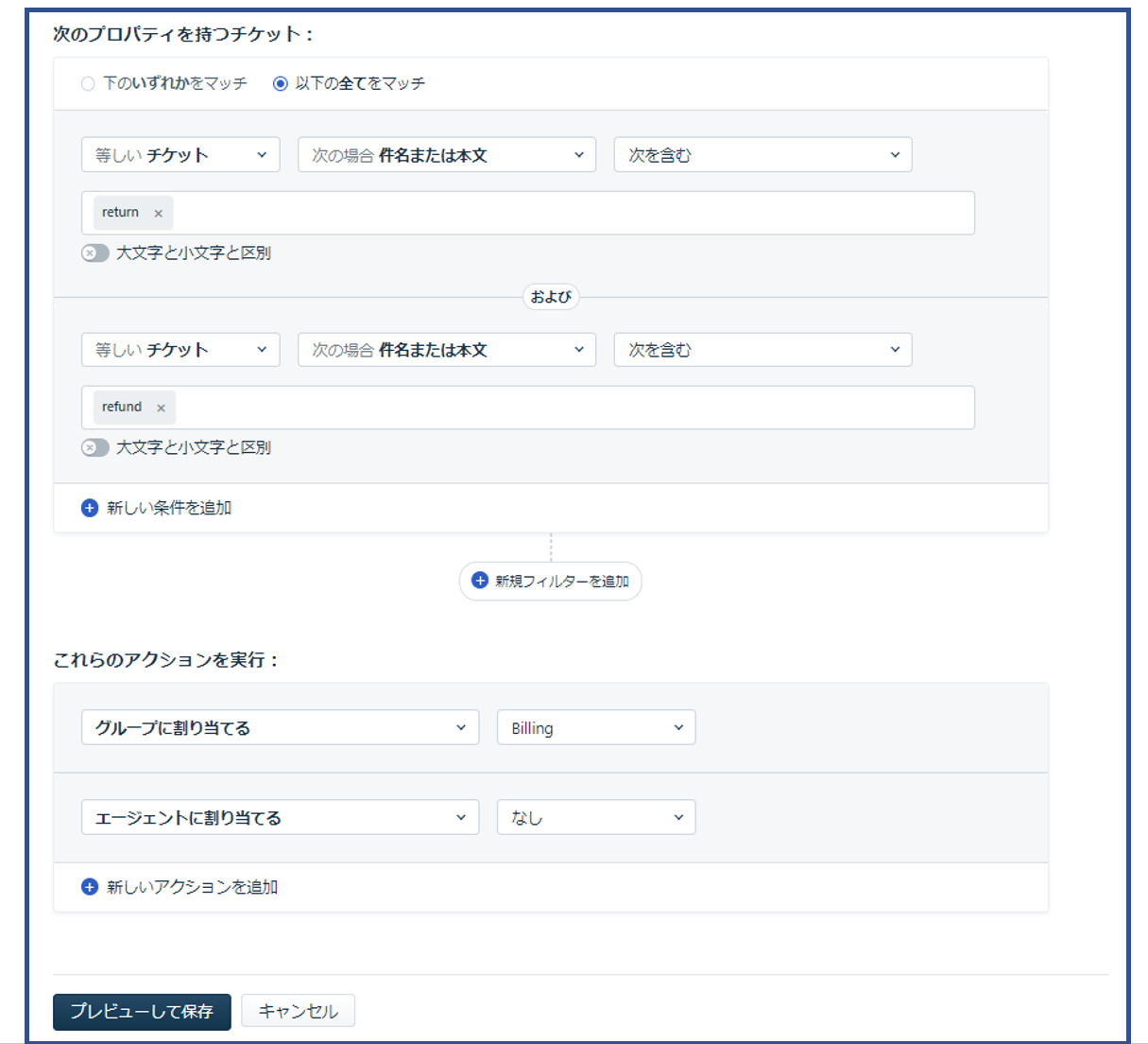 「返品」、「返金」、「交換」のタイプの全てのチケットを 「返品と返金グループ」にアサインしたい場合、ルールを以下のように設定できます。
