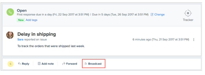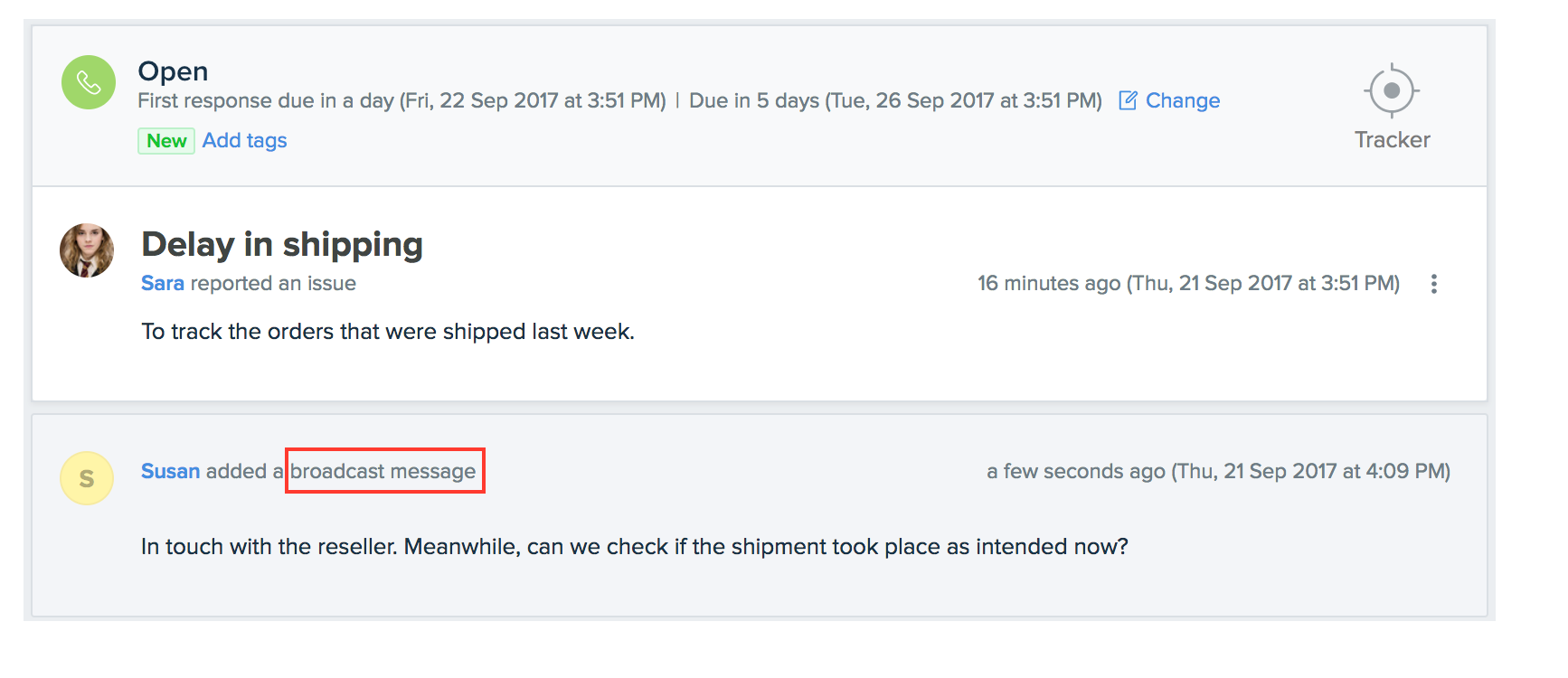 トラッカーにリンクされた関連チケットの全てについて、それらのチケットに取り組んでいるチームは内部のブロードキャストメッセージを使い、エージェントに進捗状況を通知できます。メッセージがトラッカーチケットにブロードキャストされると、メッセージが関連したチケットに伝えられます。このブロードキャストはアカウントのエージェントにのみ見えるようになっています。