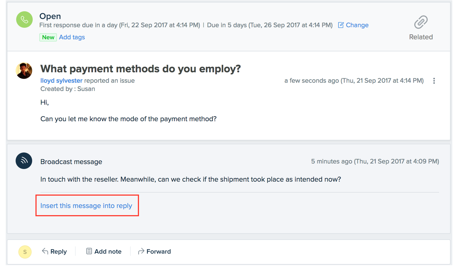 ブロードキャストメッセージはトラッカーにリンクされたどんな新しいチケットにでも追加されます。この時点で、関連したチケットには最新のブロードキャストメッセージのみがあります。すなわち、新しいメッセージがブロードキャストされると、既存のメッセージを新しいメッセージで置換します。エージェントは、「このメッセージを返信に送信」を使って返信にメッセージを追加できます。