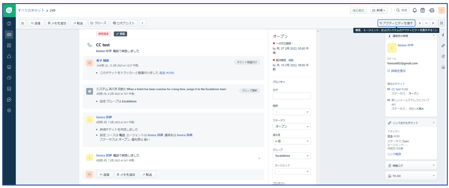 -トラッカーがエージェントに割り当てられている場合、右側のウィジェットに全ての関連チケットの一覧が表示されます。