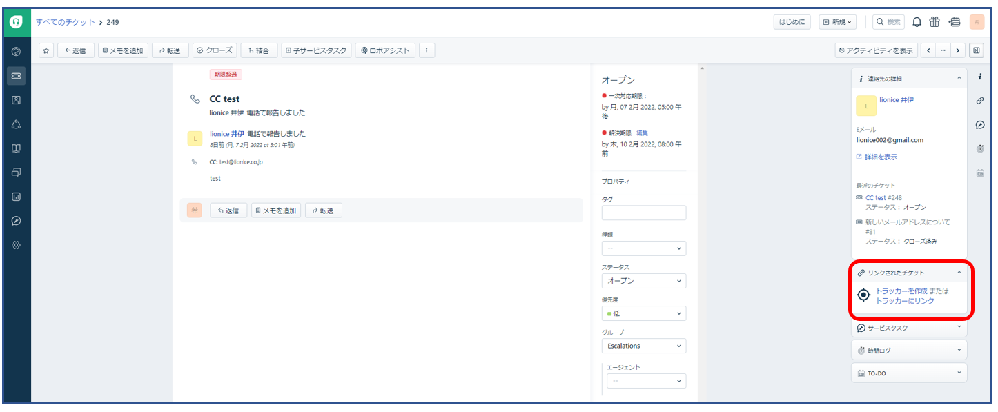 -チケットをクリックし、チケット詳細ページの右パネルにあるトラッカーにリンクオプションを選択してください。