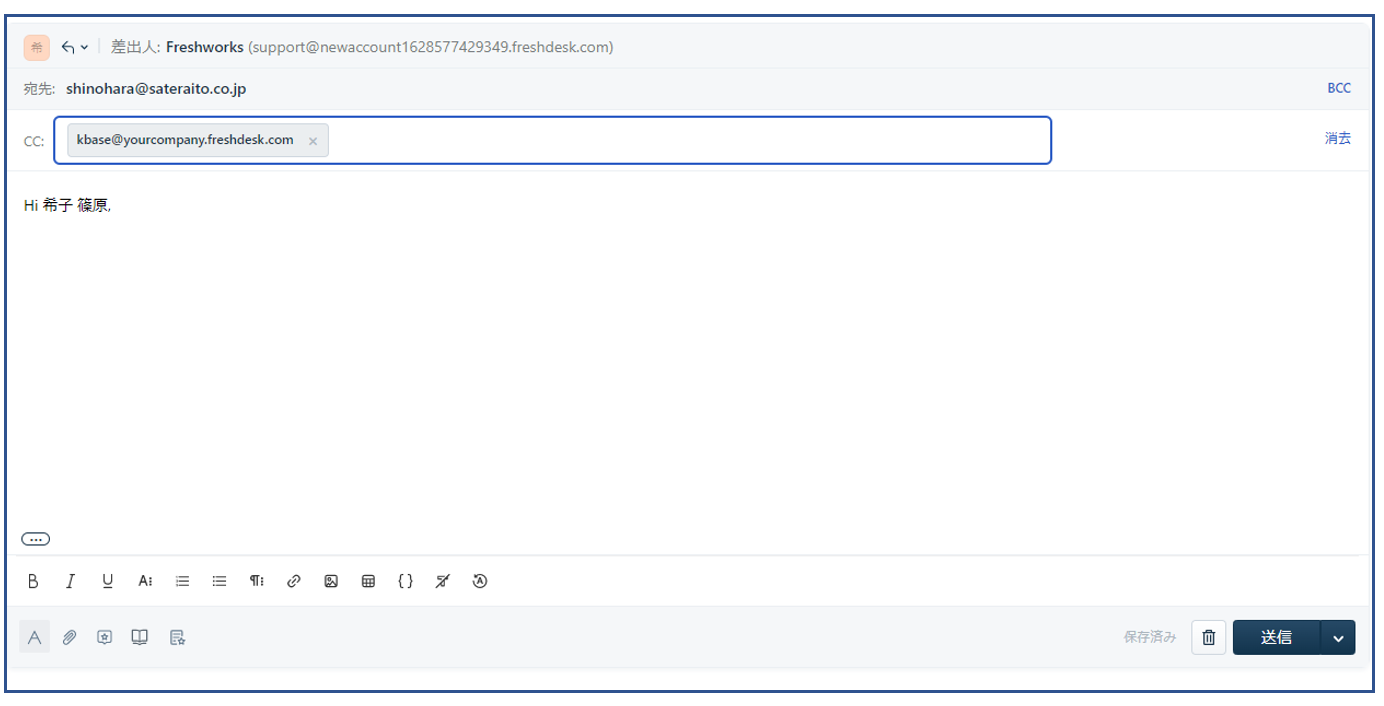 -[BCC]フィールドに、<kbase@yourcompany.freshdesk.com>を追加します。 この例では、kbase@ sauls.freshdesk.comです。